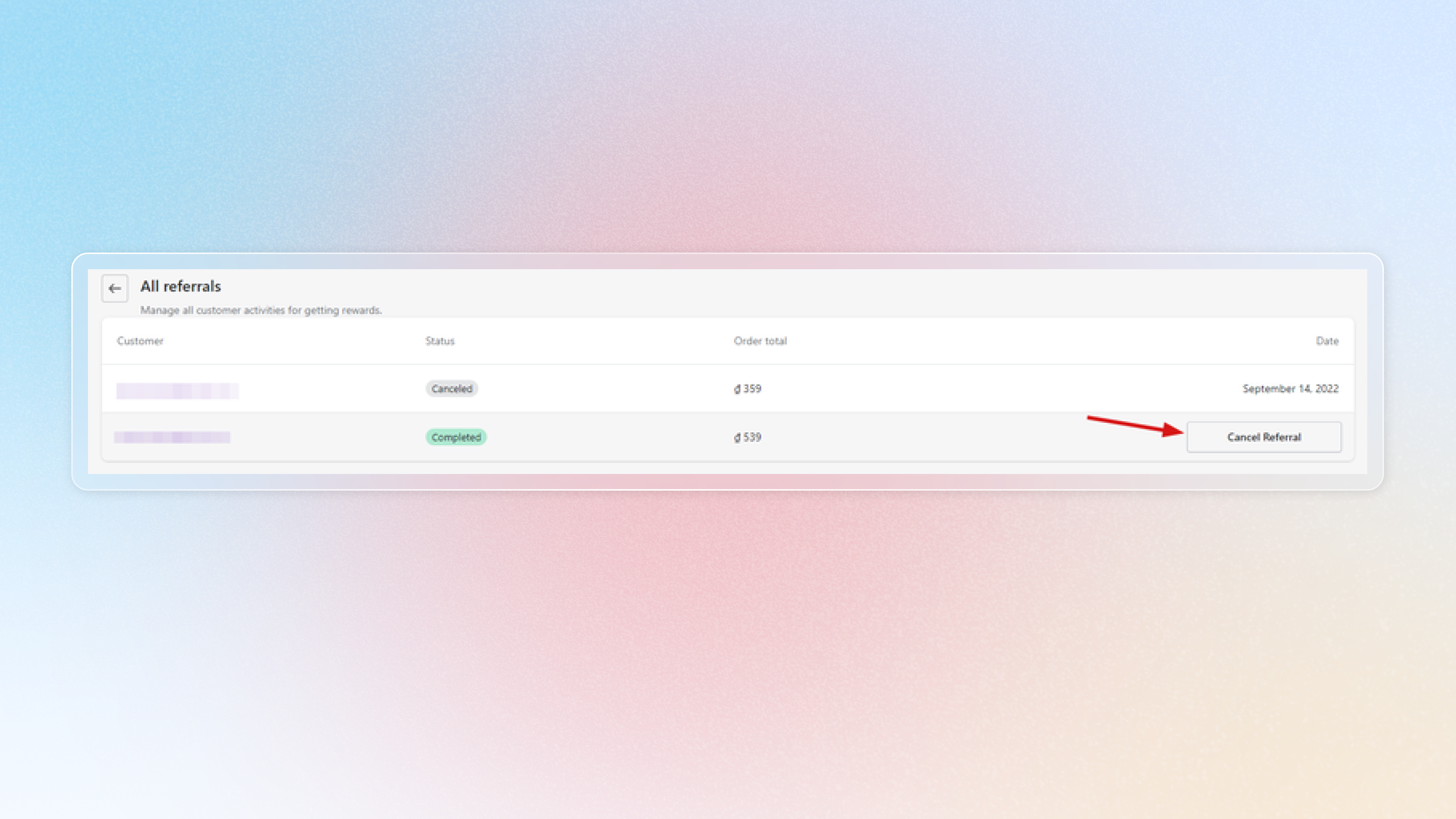 **Pending Status**: Referral is canceled, referee discount codes are voided, and referrers won’t receive new referral codes