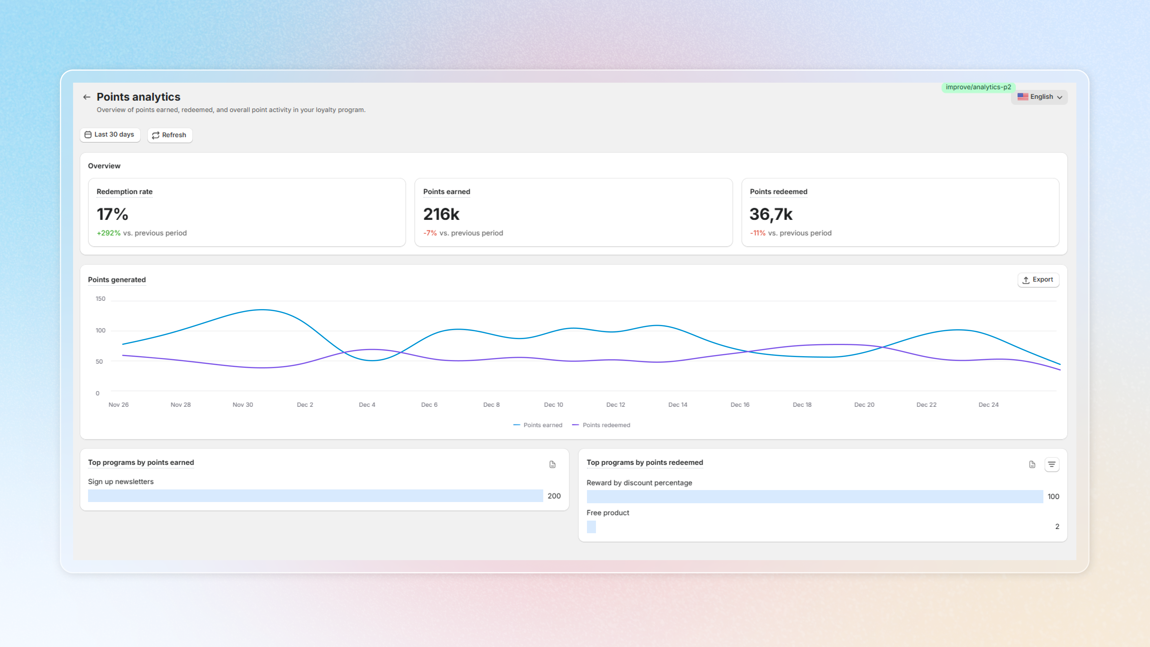 When Pending Points is on, customers who place an order have their earned points held in a **pending** state during your return/refund window, and then converted to real points. Until now, pending points weren't visible in Analytics — they only showed up in each customer profile. Two new surfaces fix that.