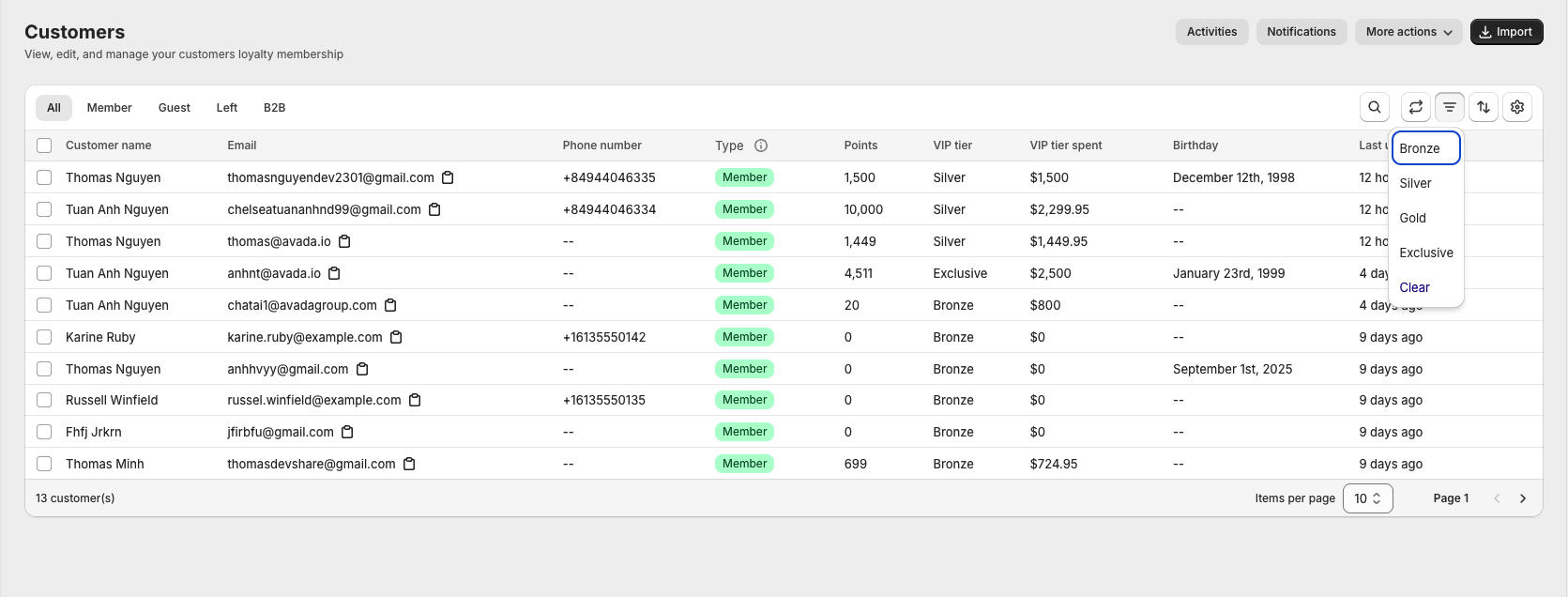 The customer grid gives you a fast, high-level understanding of your loyalty audience. Instead of opening each customer profile, you can quickly assess their current loyalty status from here. It is especially useful for support conversations, audits, or when you want to review VIP tiers or point balances at scale.