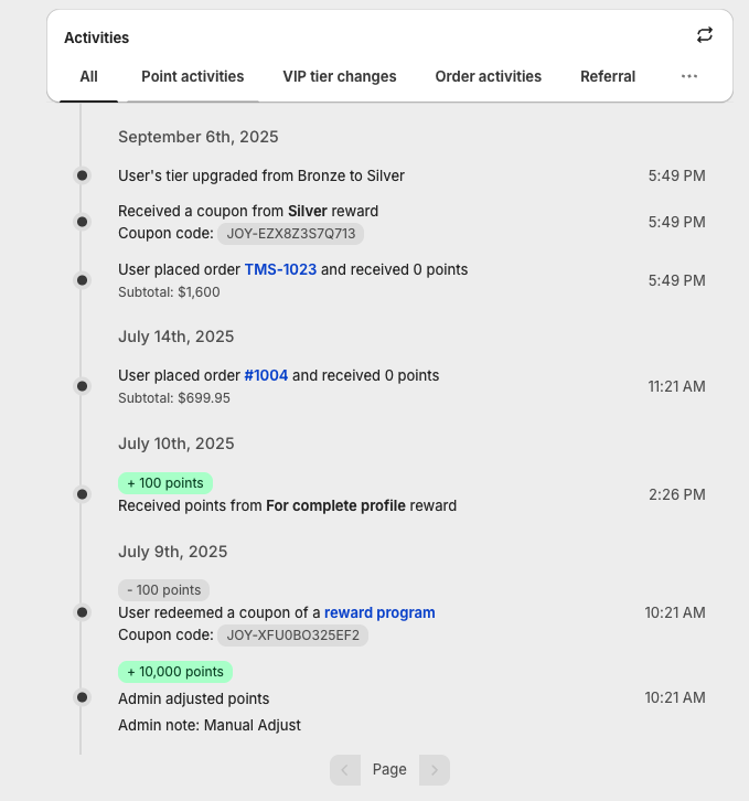 This is the full timeline of the customer's loyalty activity — orders, earned points, tier upgrades, manual adjustments, redemptions, expirations, and referral events. When a customer asks "Why did I receive these points?" or "Why didn't I level up?", this timeline gives you the exact answer.