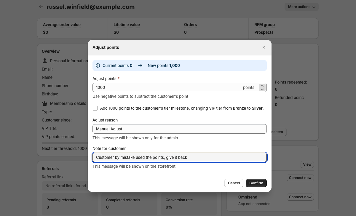 Use this when a customer is missing points, needs a correction after a refund, or requires goodwill compensation. You can add or subtract points, choose whether the adjustment affects VIP tier progression, and leave an internal note or a customer-facing message. This is also where you can manually fix balance issues.