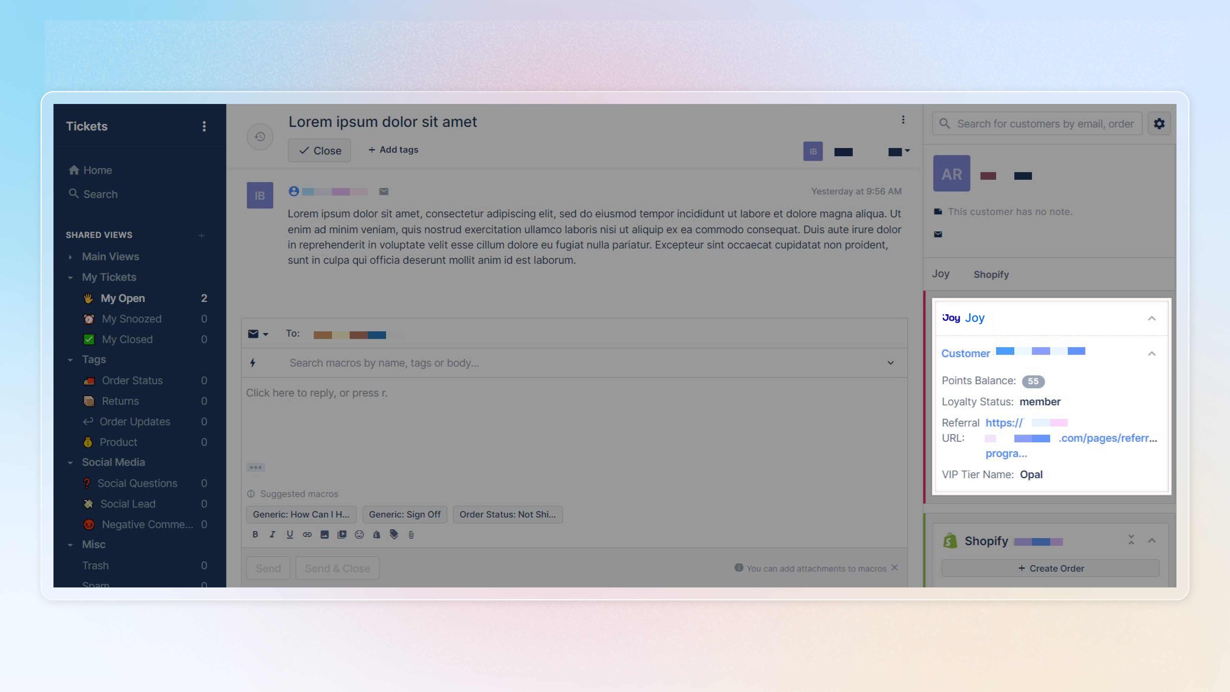 The Joy-Gorgias integration improves customer support by letting you quickly access loyalty info, speeding up responses and ensuring accuracy. It also helps to personalize service with detailed loyalty data and manage loyalty programs in one place.