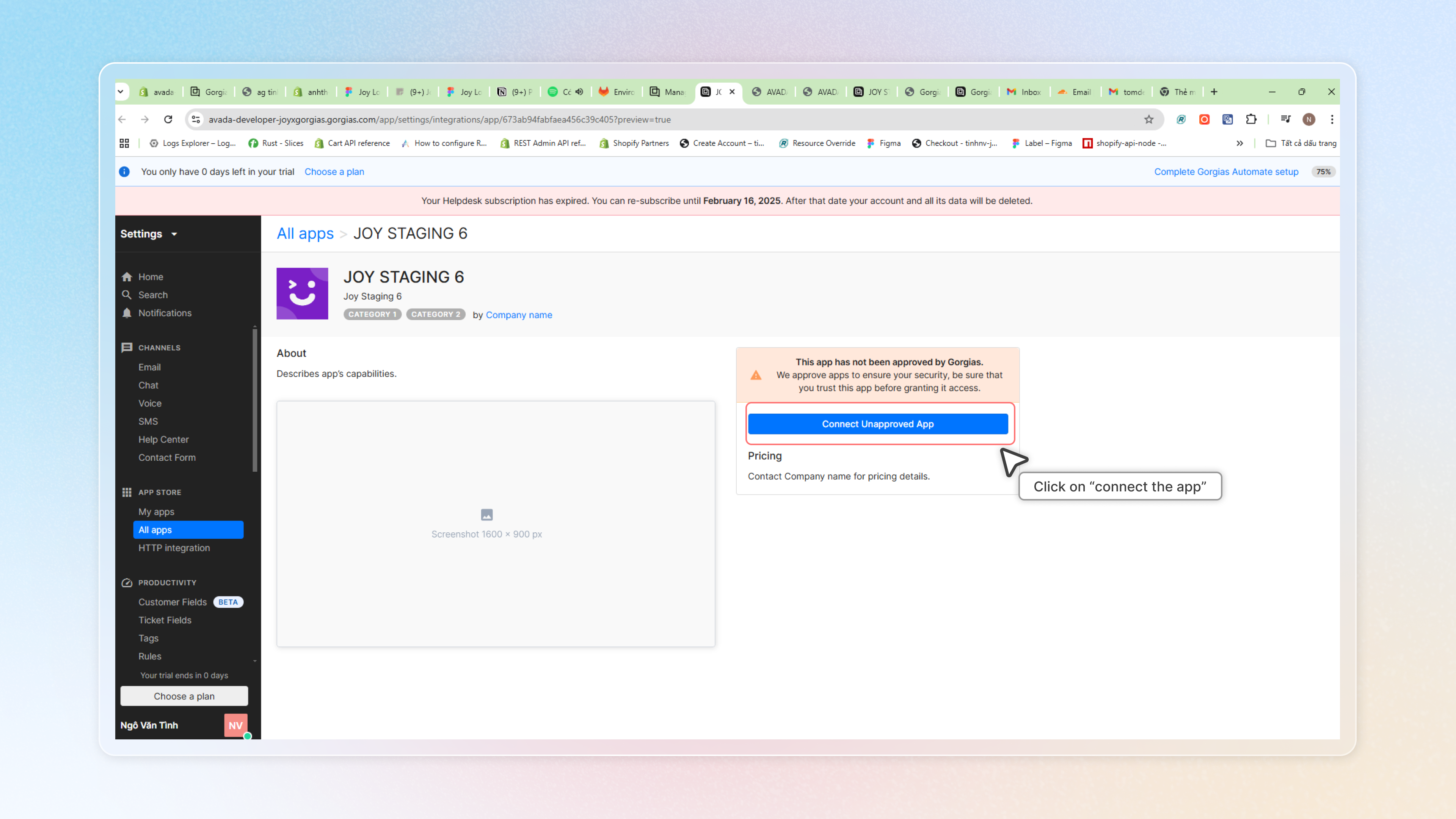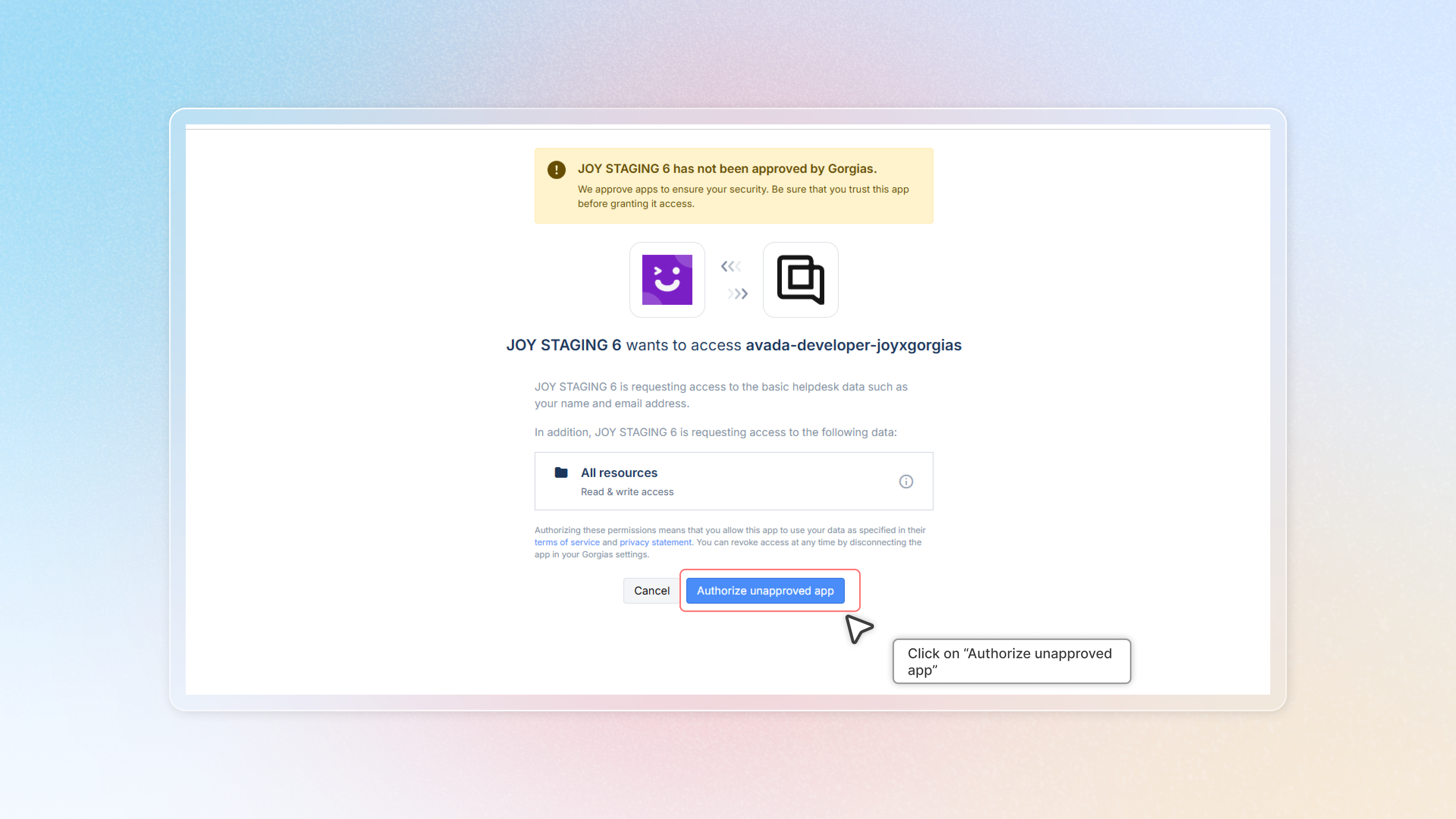 Click on "**Connect the app**" to integrate with Joy Loyalty. Then choose "**Authorize unapproved app"**