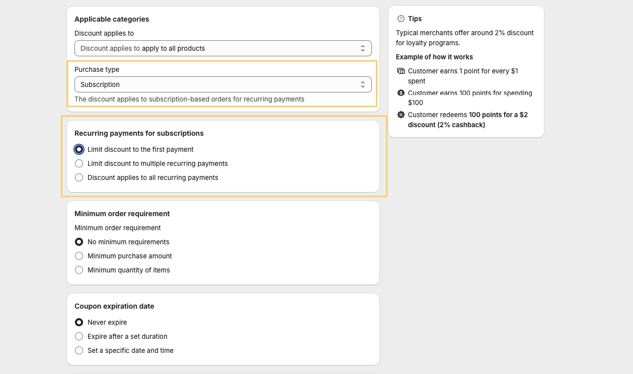 > 💡 Most merchants choose to let coupons apply to **only one cycle** to avoid ongoing discounts for the same redemption.