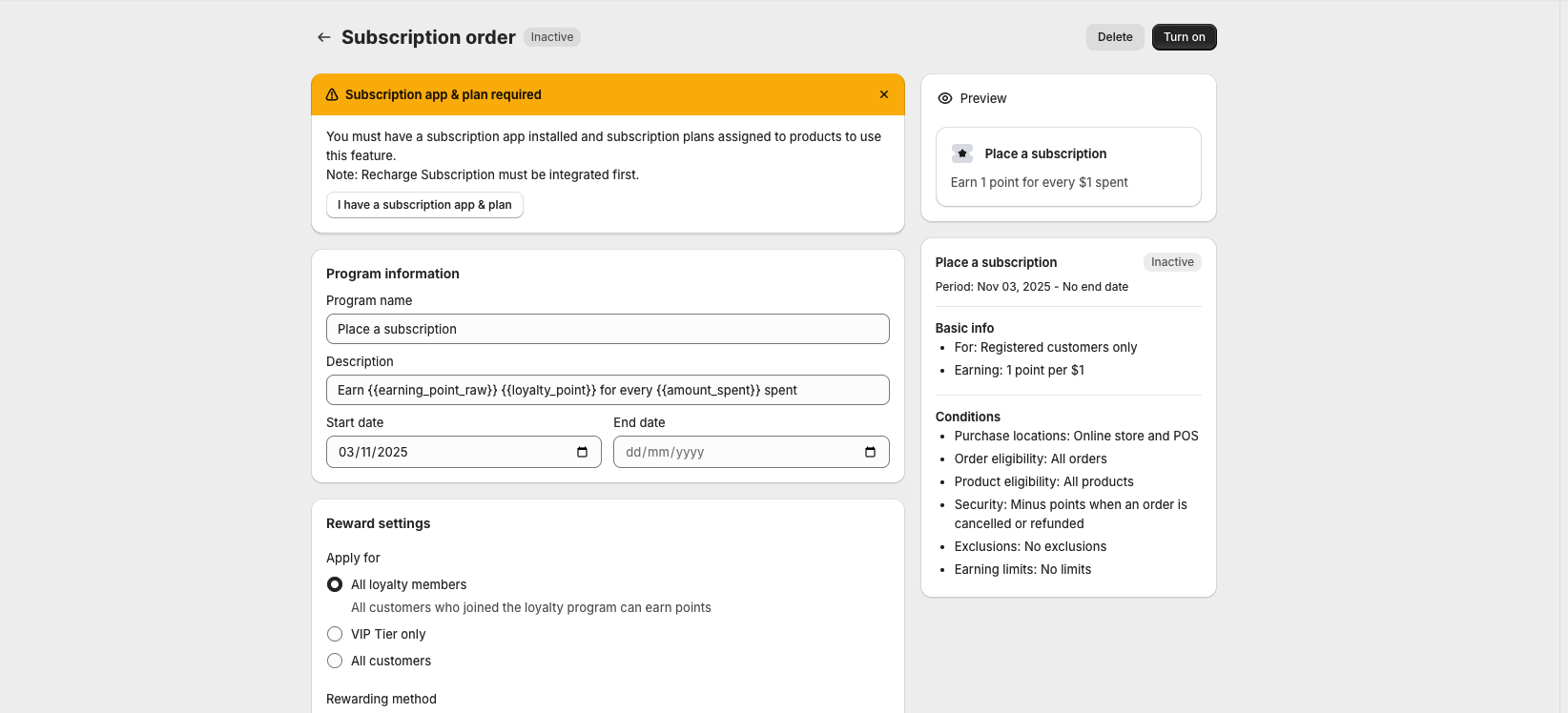 4. Configure the reward conditions just like any other earning rule — set how many points customers earn, define eligible conditions, and save the program.