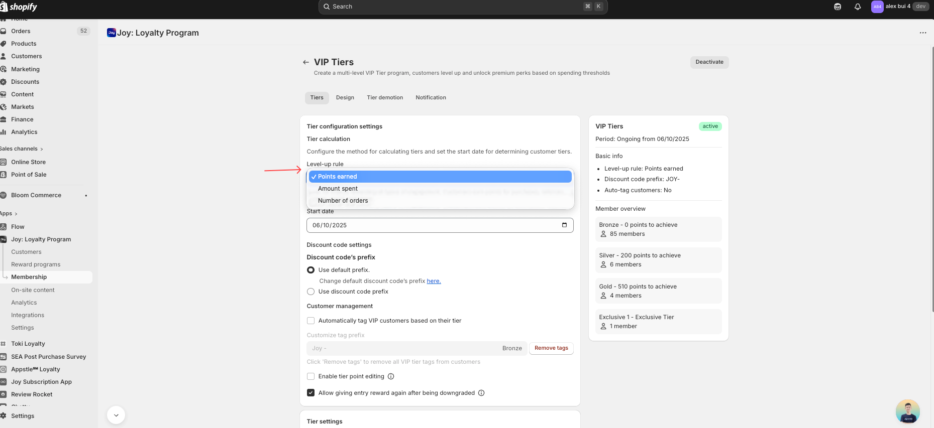 **Tier calculating rule:** Define the method for calculating customer tiers. You can choose between **Points earned**, **Amount spent**, and **Number of orders**. Choosing between them depends on how you want to structure your program.