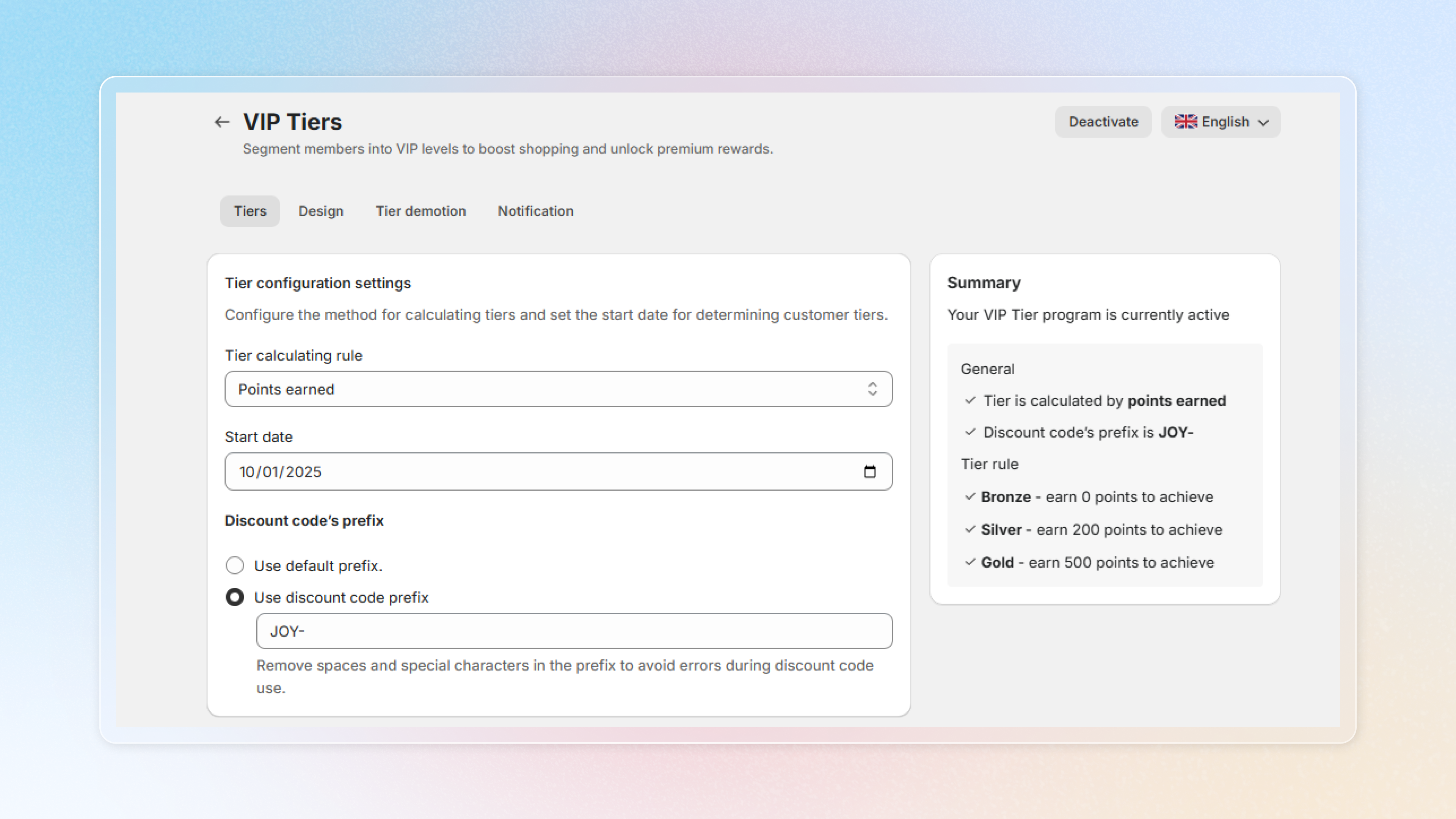 **Discount code's prefix**: Personalize the prefix for discount codes generated within your VIP Tiers program. Make it match your brand.