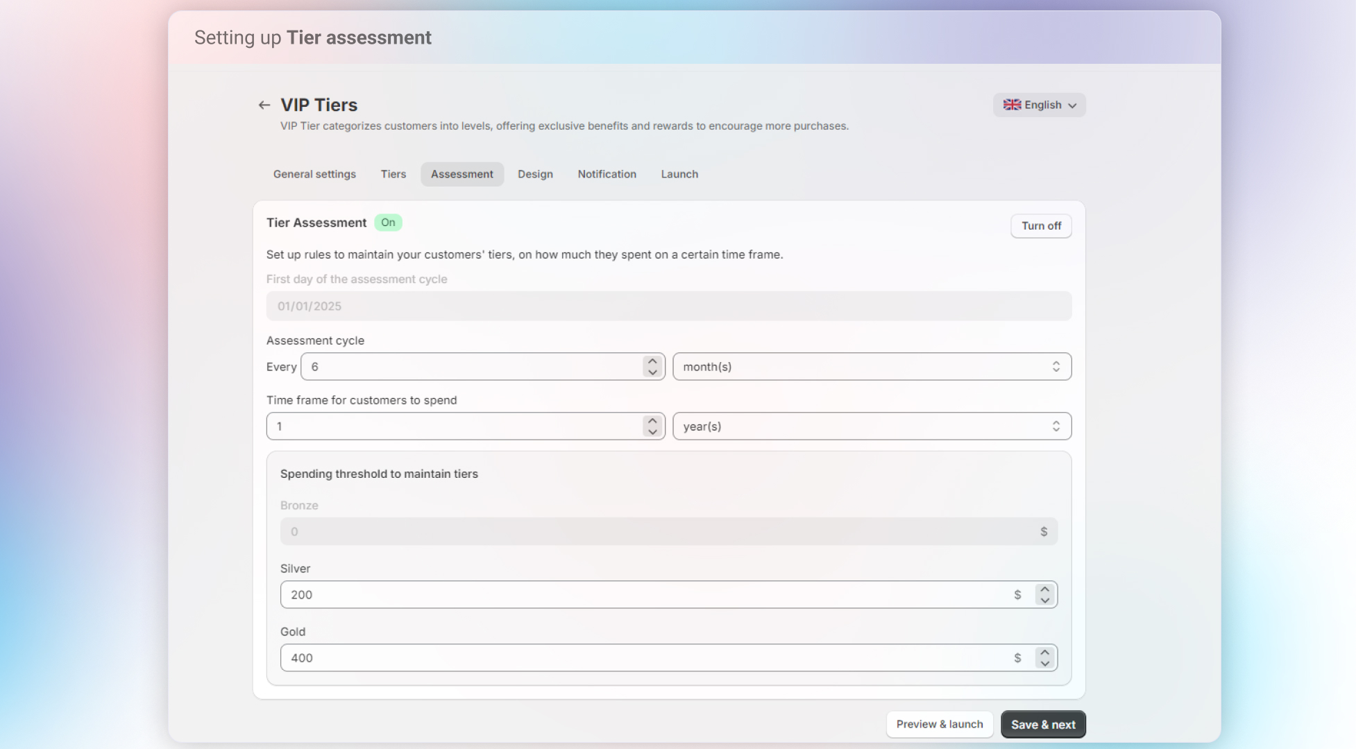 * **Assessment Cycle**: Set how often (X months) the system reviews spending for tier retention.