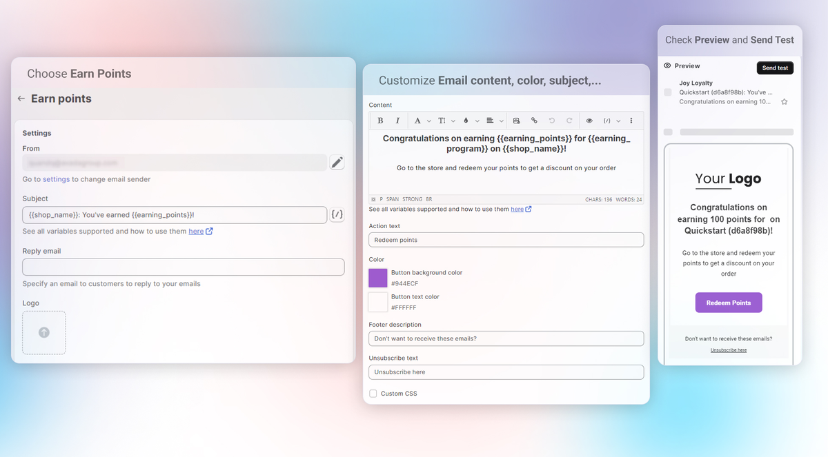 Each template can be customized. You can edit subject lines, update the content, upload your logo, change colors, and add personalized variables like customer name or point balance. Before activating, preview the message or send yourself a test email to make sure it feels right.
