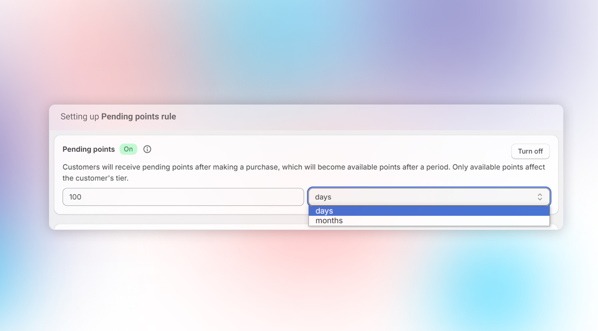 Once the feature is on, configure how long Pending Points stay pending before converting into Available Points (e.g., 8 days to match your return window).
