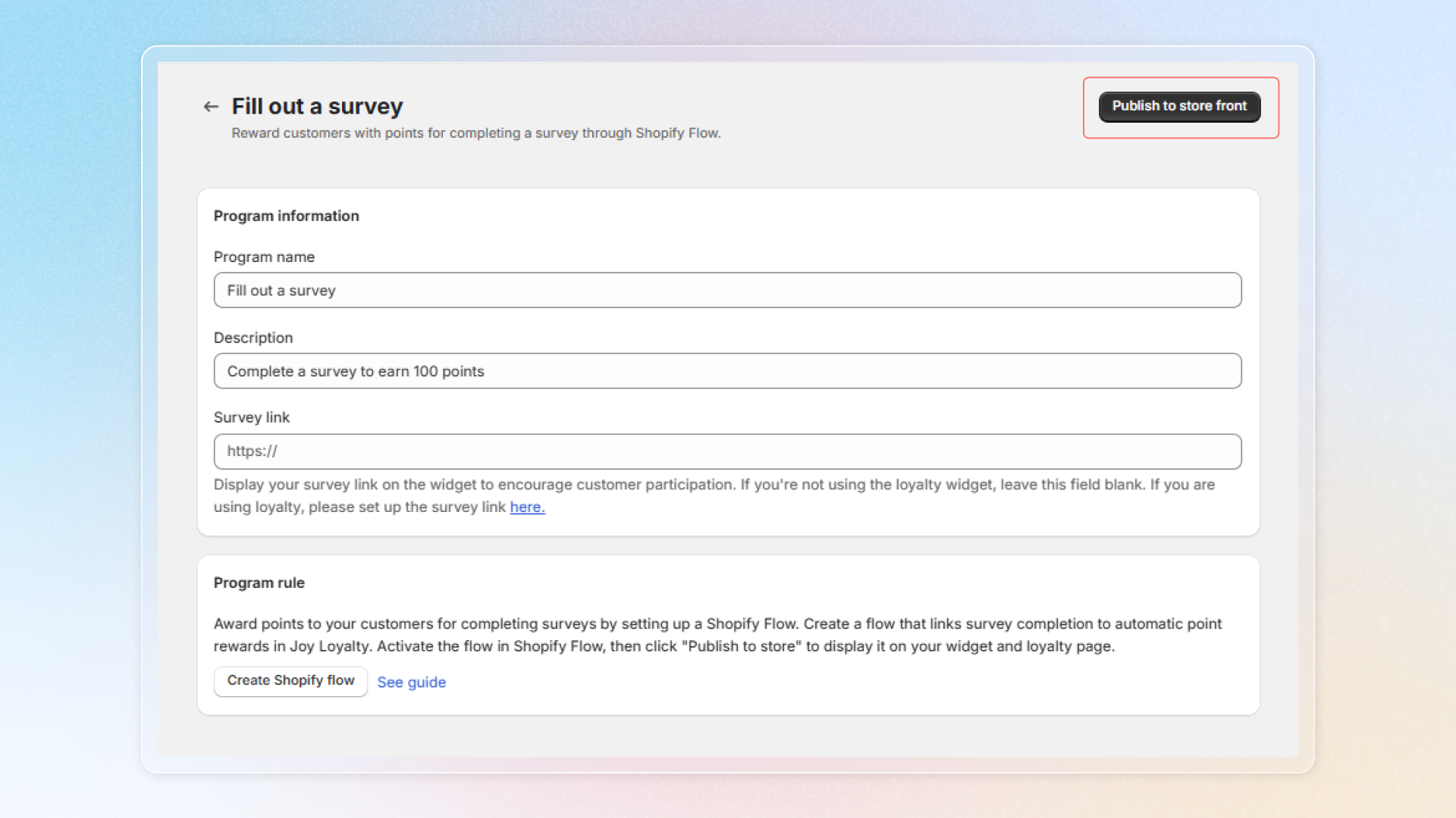 Click on **Create Shopify flow** and follow our guide to create a flow connecting survey completion to reward distribution