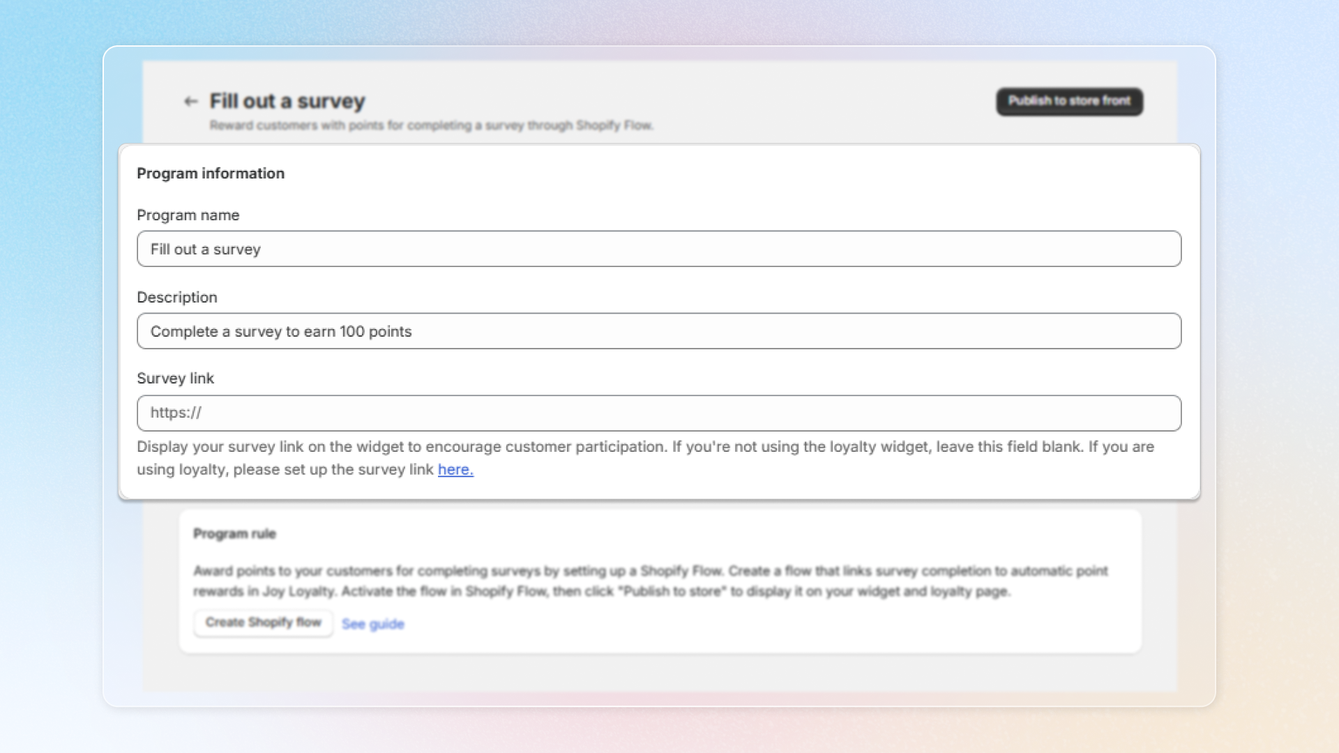 Choose **Reward programs** -> **Earning programs** -> Click **Add rule** -> Choose **Fill out a survey**
