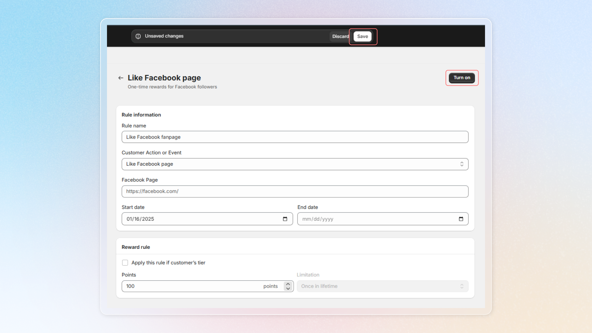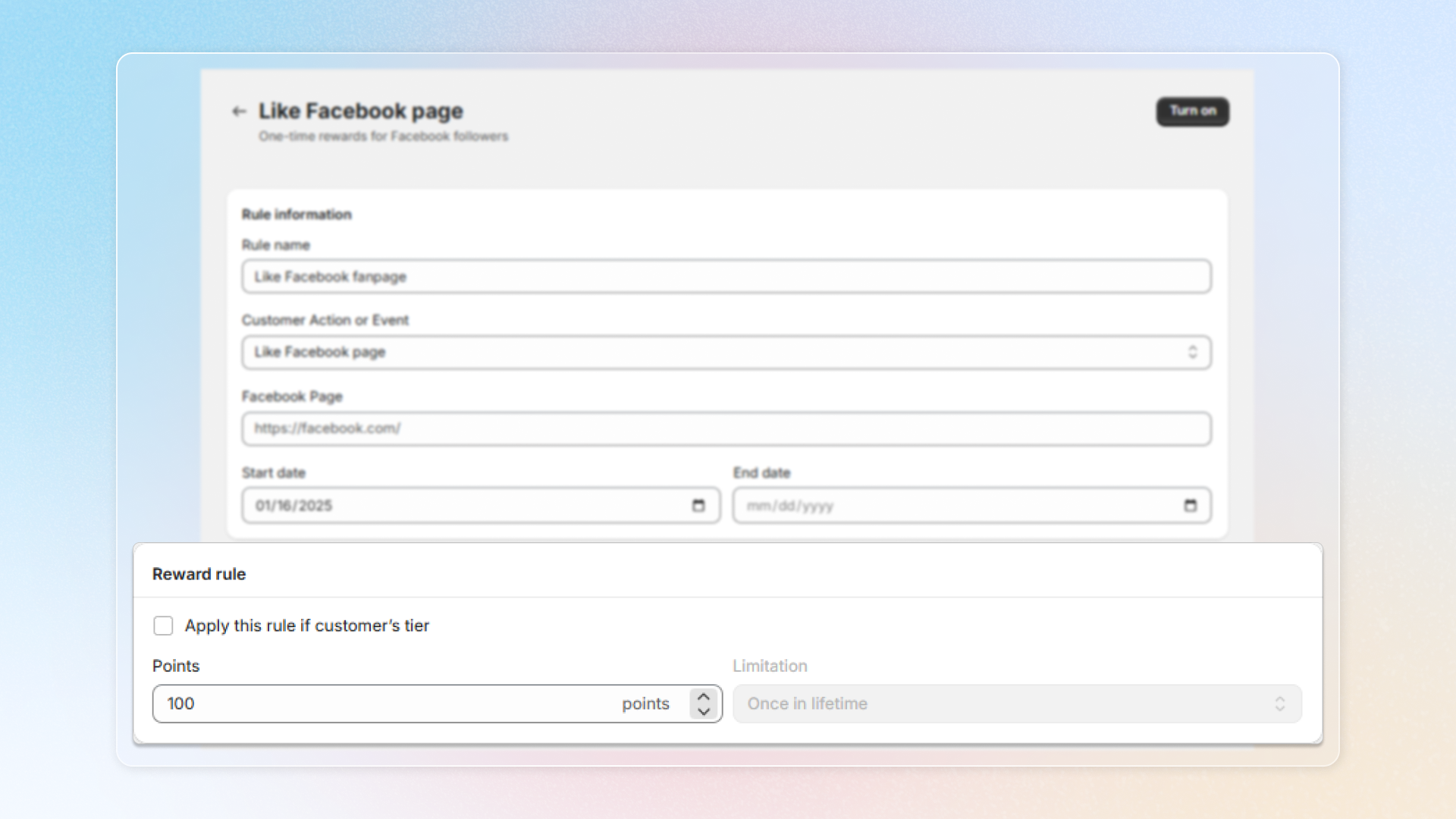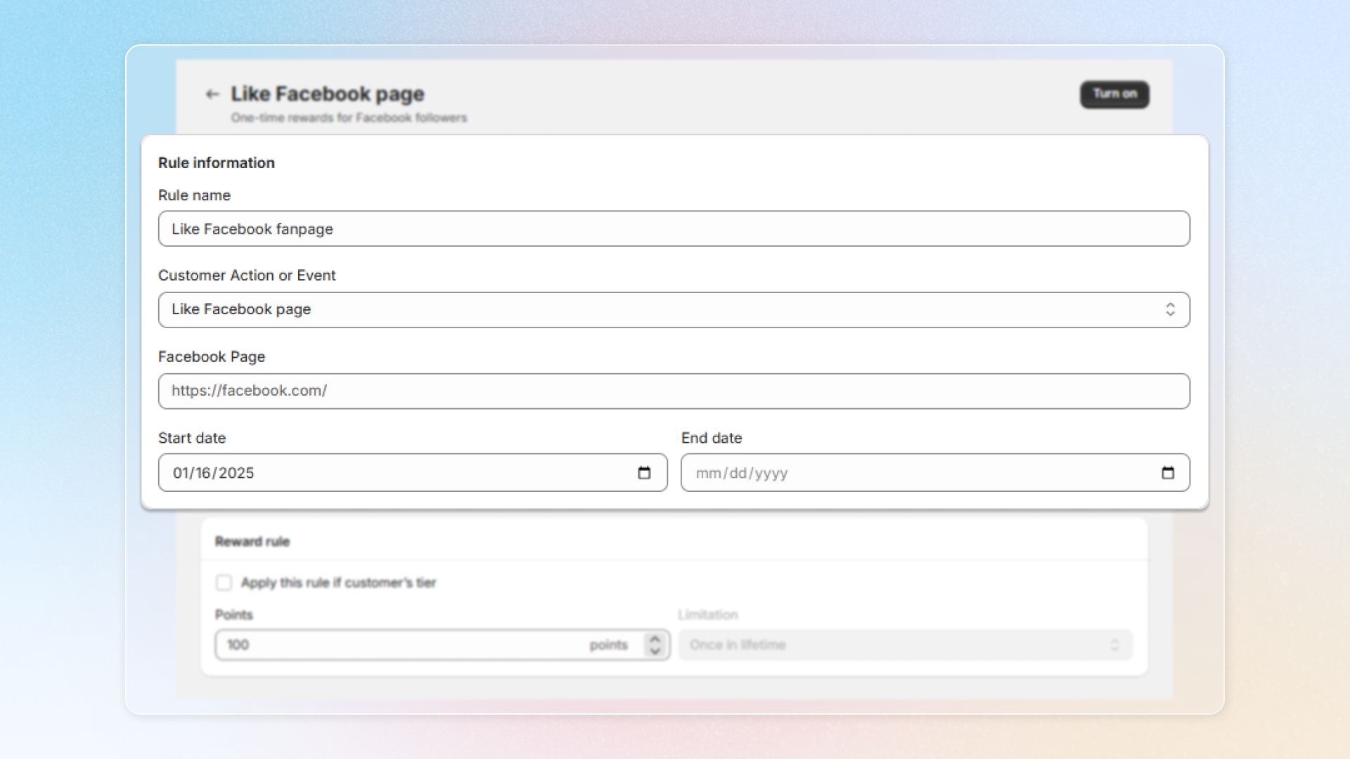 Choose **Reward programs** -> **Earning programs** -> Click **Add rule** -> Choose **Social activity**