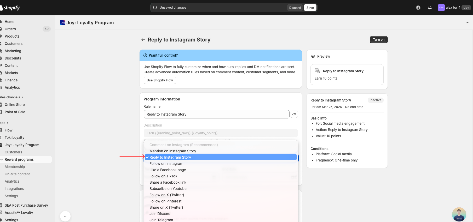 **Shopify Flow alternative:** Joy also supports a native Shopify Flow trigger — **"Customer replied to Instagram story"** — which fires whenever a qualifying reply is detected. You can use this to build custom automations (e.g., send a Klaviyo email, create a Slack notification) instead of or in addition to the built-in DM. Toggle **Use Shopify Flow** inside the program to switch to Flow-based messaging.