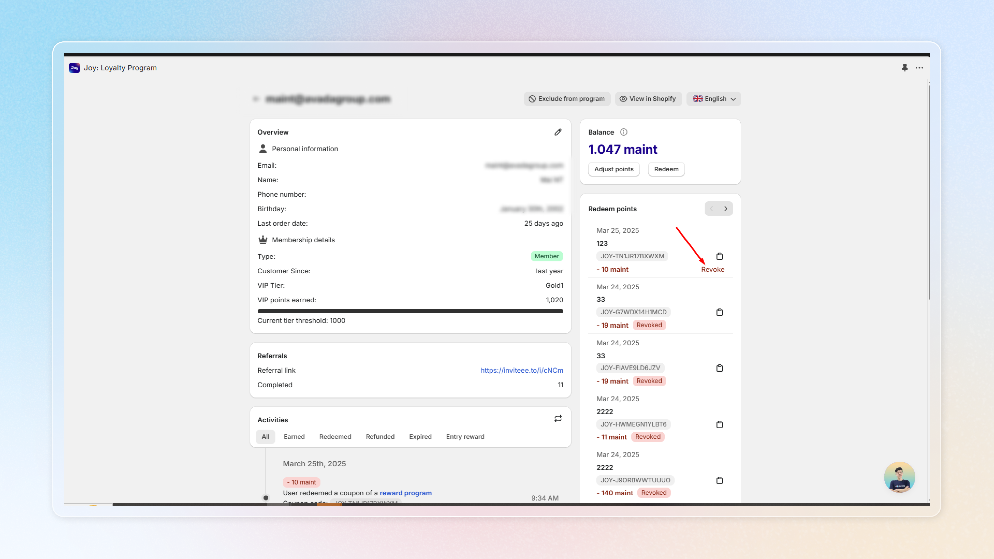 In Joy, choose **Customers** > click on **Customer name** > **Revoke coupon**