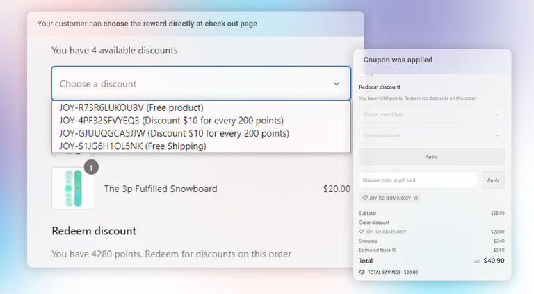 Customers will see their redeemed coupons at checkout and can apply them with a click. If they switch coupons, the previous one is removed and made available for future use.
