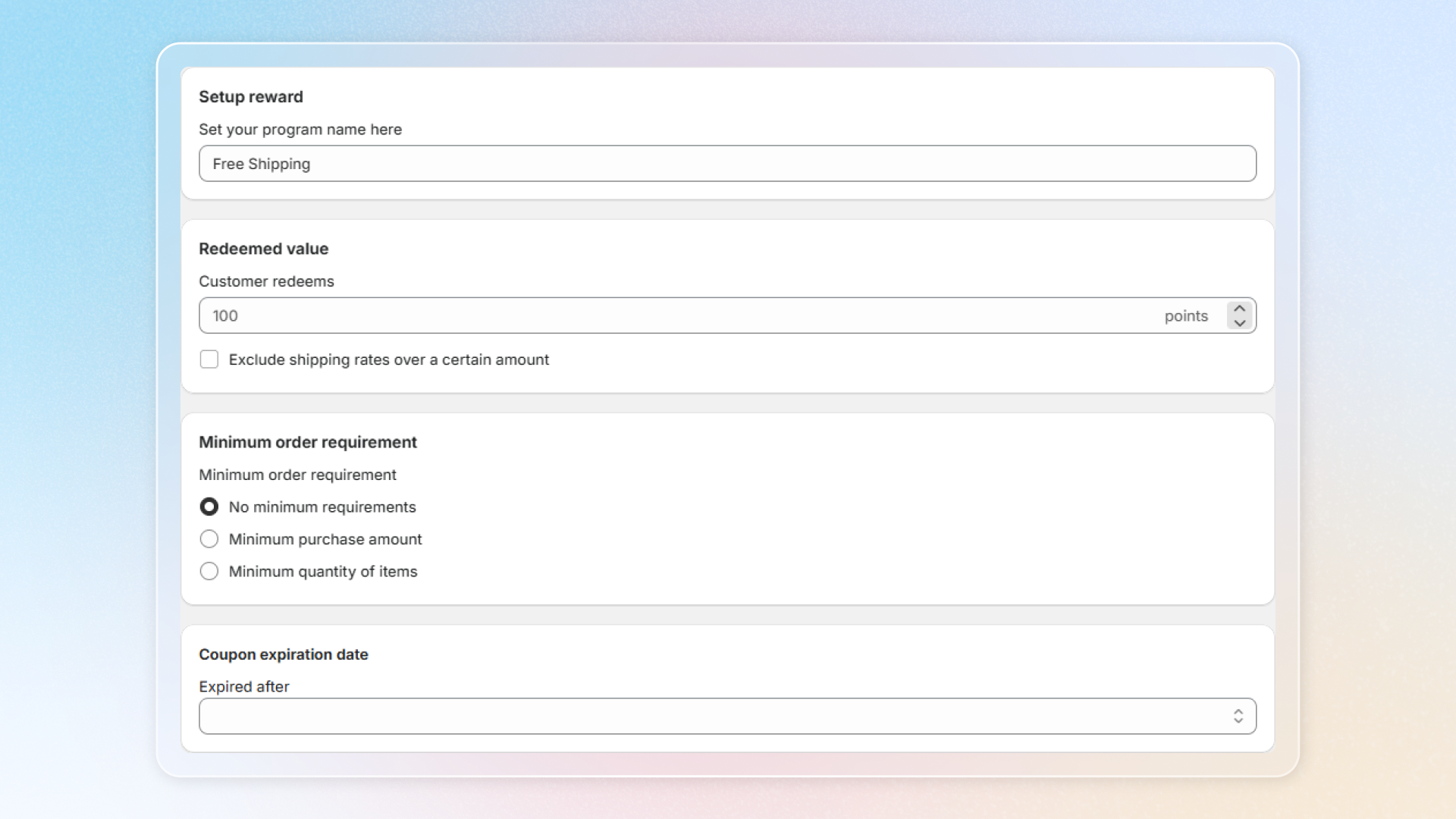 * **Setup rewards**: Enter a program name (e.g., "Free Shipping Rewards")