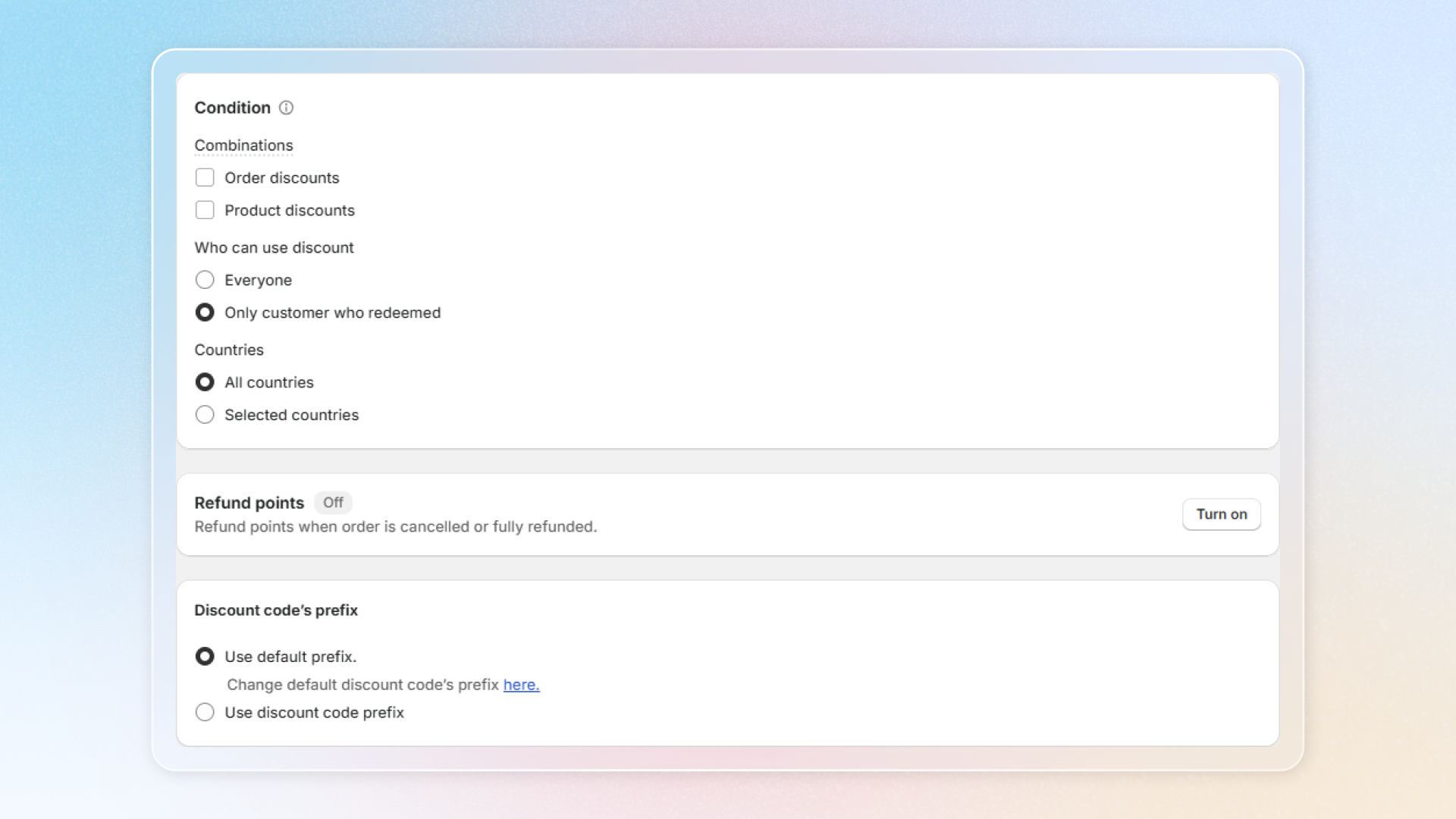 * **Sales channels**: Pick where customers can redeem