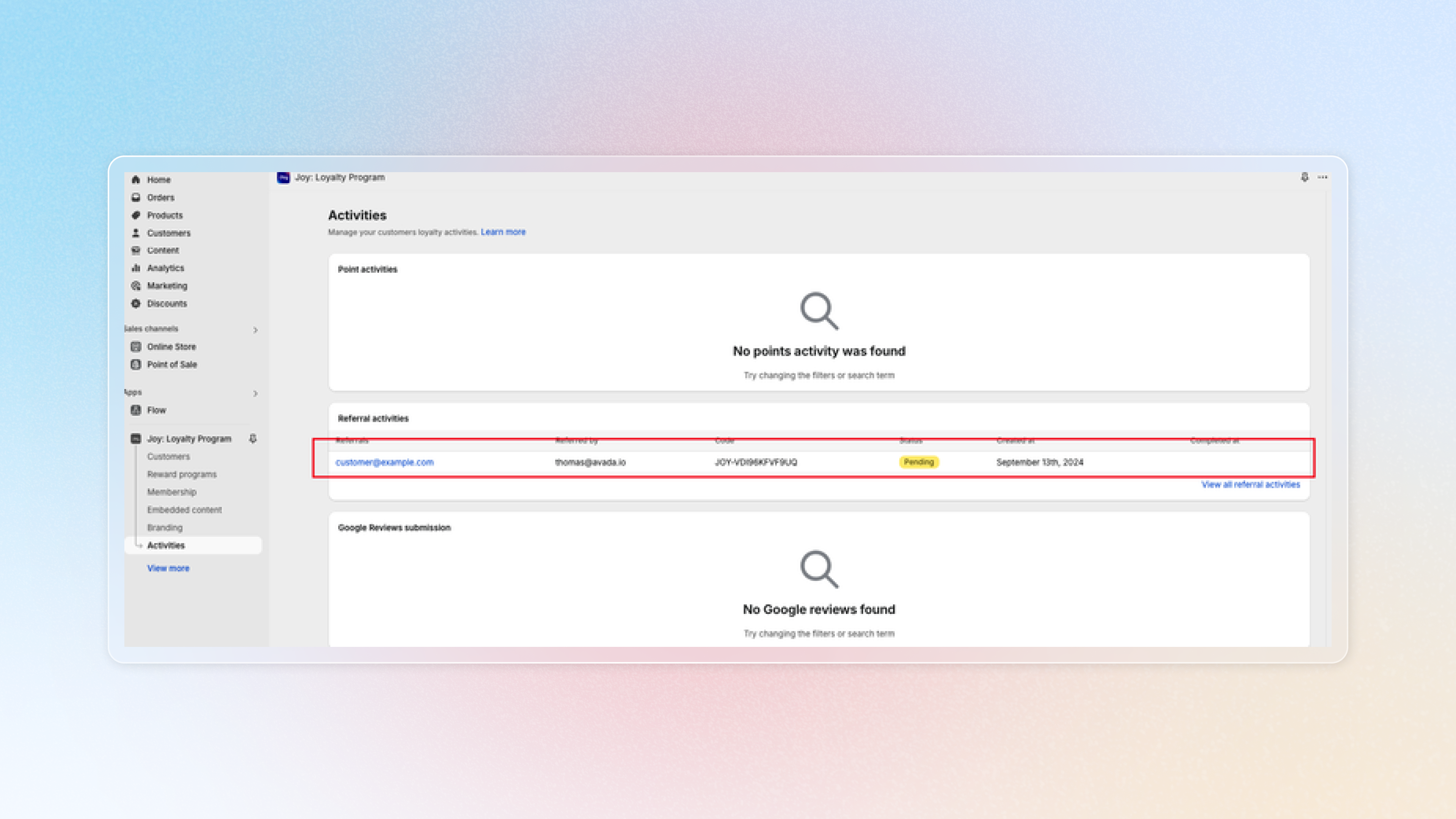The referred customer fills in their email to claim the reward you’ve configured in the program. Once they’ve done this, a pending referral activity will appear in the app.