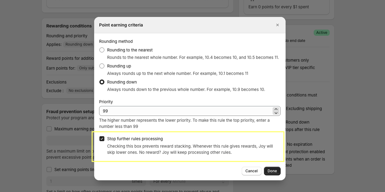 Yes. Each program includes a "Stop further rules processing" option. When enabled, Joy will skip all lower-priority programs if this rule successfully gives a reward. If no reward is granted, Joy continues evaluating the rest of the rules. This is especially useful for tier-exclusive earning programs — since each tier has its own program with its own rate, enabling this option ensures only the matching tier's program applies and the others are skipped.