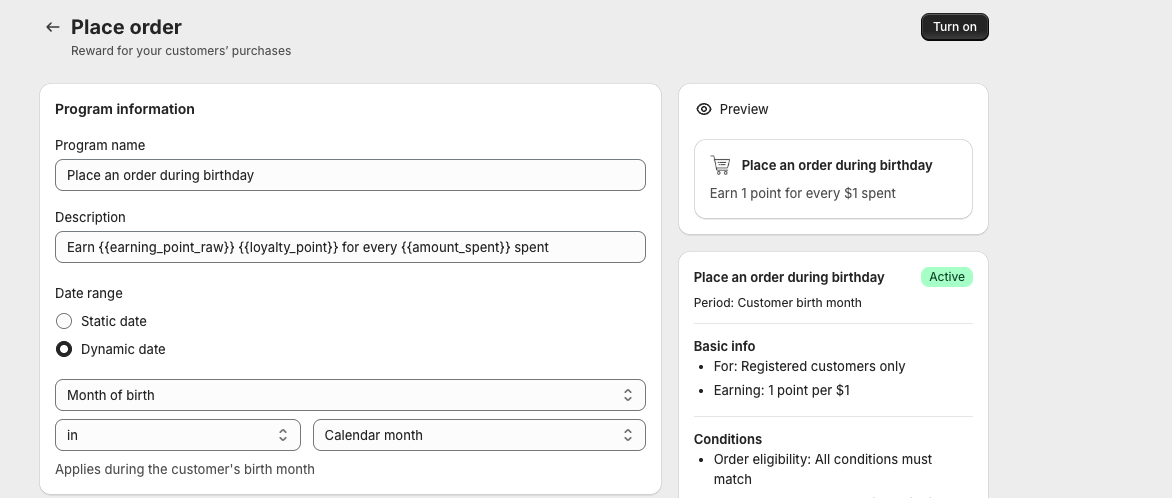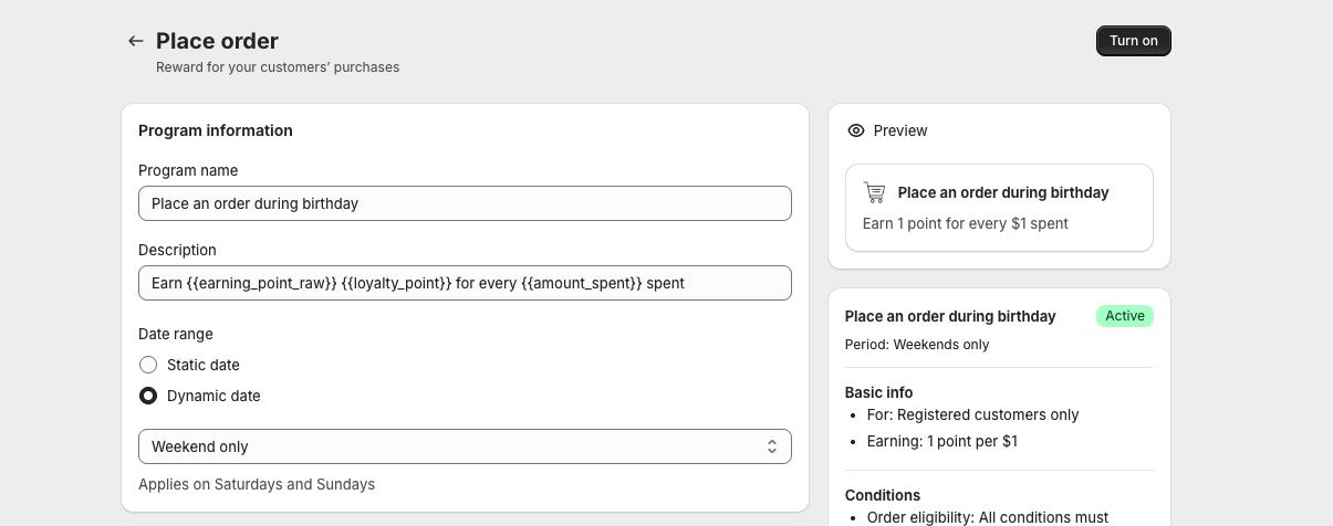 This structure gives your loyalty program far greater flexibility. You can build dynamic earning rules that respond to real business scenarios: seasonal promotions, high-value order incentives, product-specific multipliers, weekend or after-hours bonuses, birthday-month boosters, or targeted campaigns for selected customer segments.