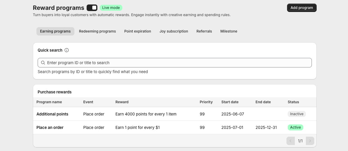 Every earning rule you create acts as its own program. When a customer performs an action such as placing an order, Joy evaluates all active programs and applies every program whose conditions are met.