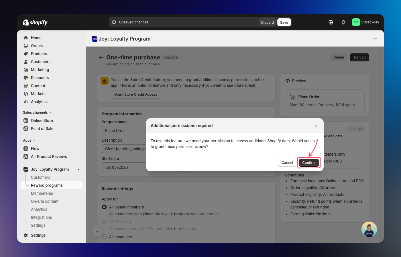 Click the Grant Access button inside the banner. A confirmation popup will appear — click Confirm to authorize Joy Loyalty to manage store credit balances on your customers' Shopify accounts.