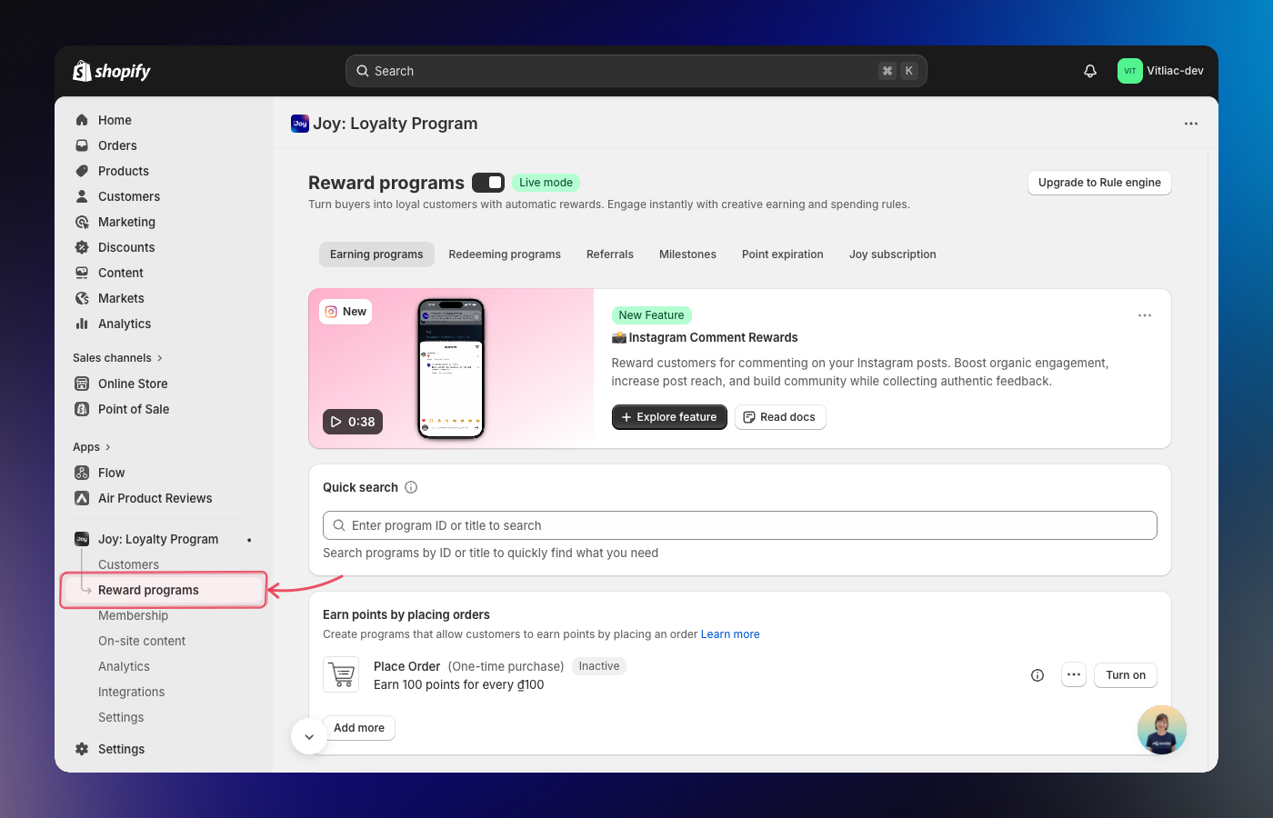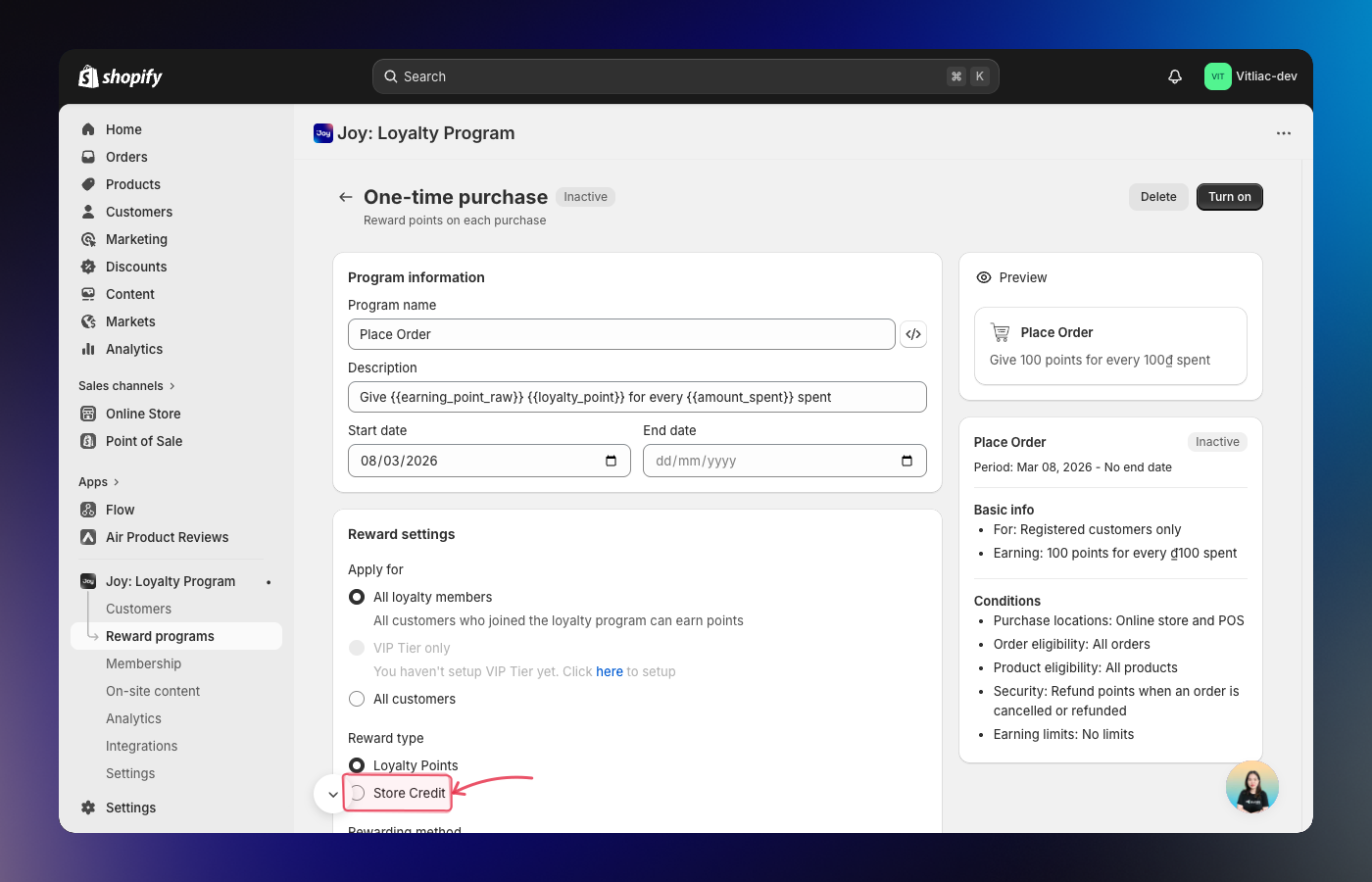 Go to Reward programs and open or create a program that supports Store Credit: Place Order, Milestones, Referrals, or Shopify Flow.