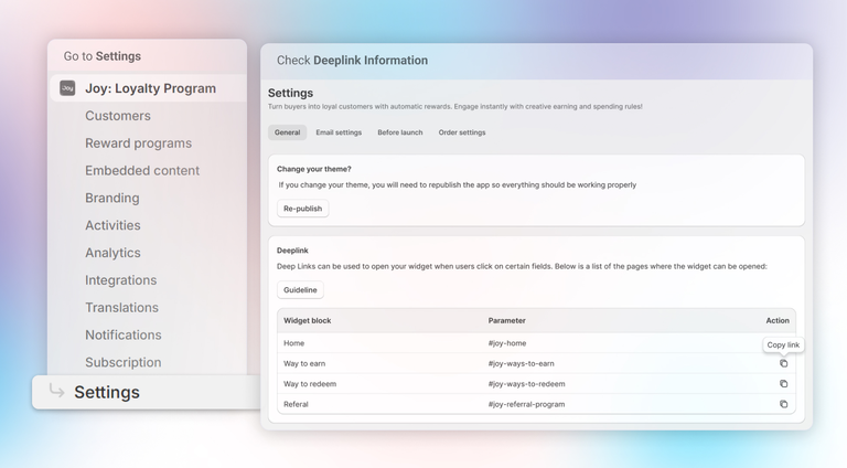 Deeplink is a feature that simplifies access to the Joy widget directly from your store's website. By adding Deeplinks to your menu or footer, customers can quickly open the loyalty program interface, improving their interaction with your store.