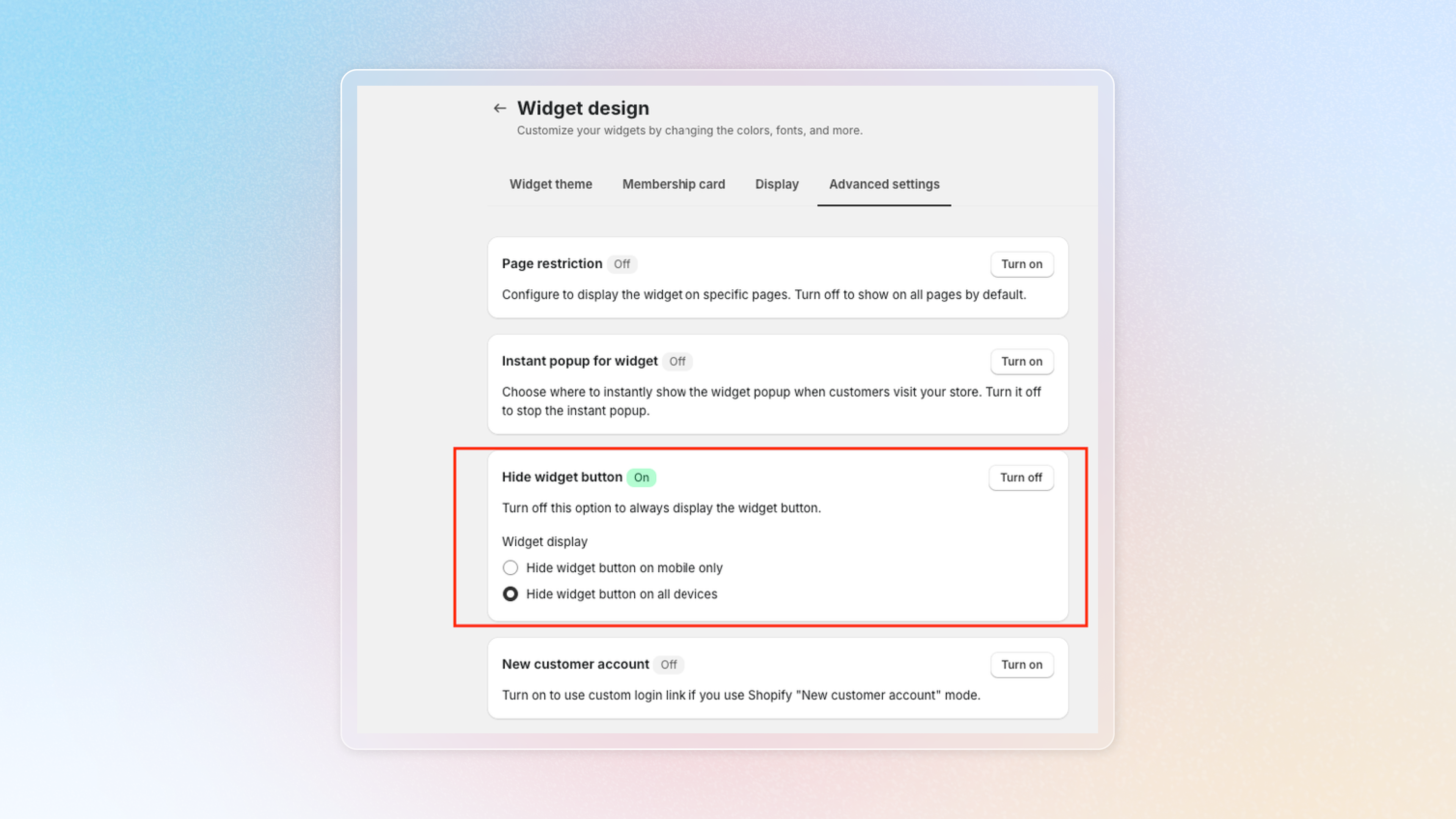 In **Widget Design** > **Advanced Settings**, simply toggle the **Hide Widget** option. This will hide the floating button, but the widget will still function and can be triggered via a deeplink or our [JS SDK](https://devdocs.joy.so/joy-javascript-api/widget-methods#open-widget).
