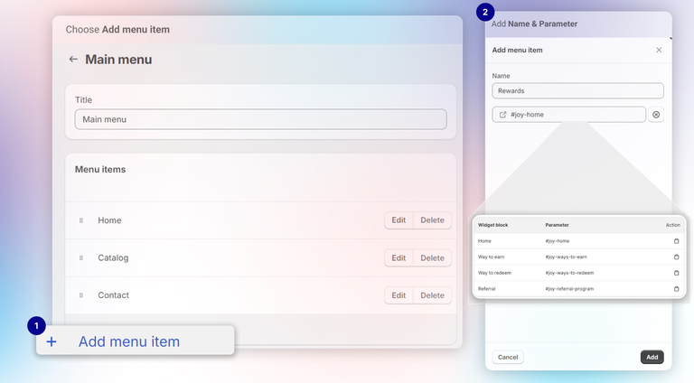In the example below, I chose the **Main menu** and added a **Rewards** item to it. I then pasted the parameter `#joy-home` into the link field. After saving all the settings, clicking "Rewards" in the menu will automatically display the Joy widget's home page.
