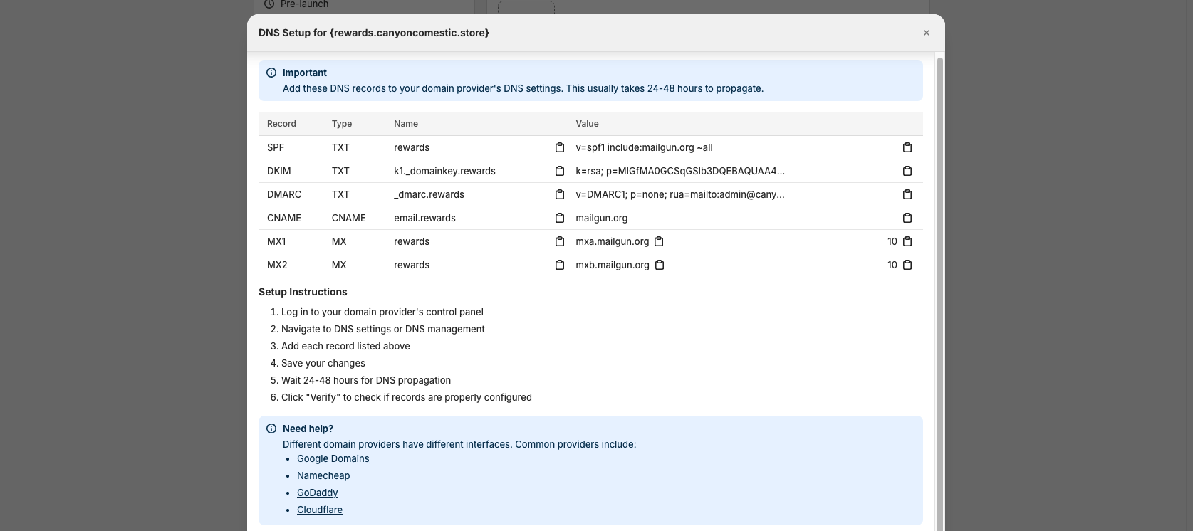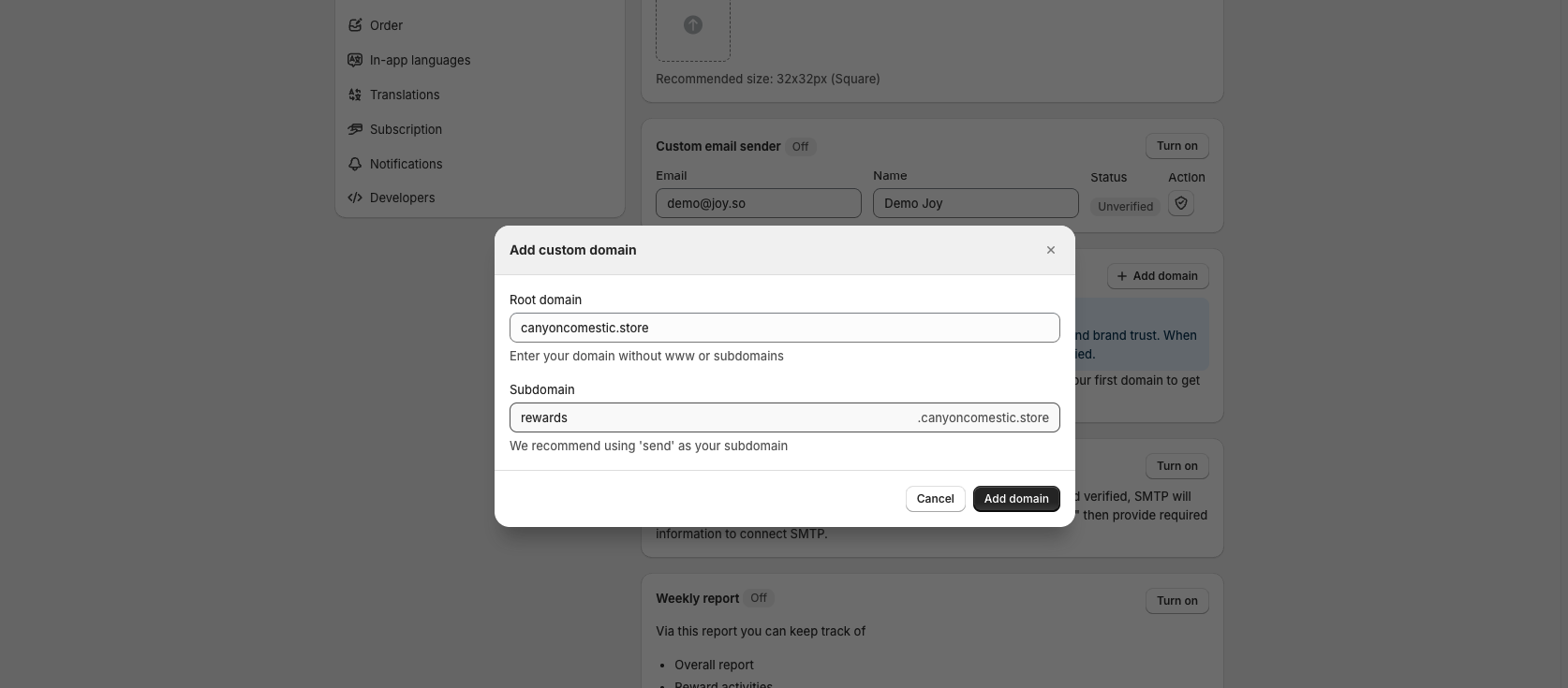 Go to the Joy app, open the Settings > Email page, and find Custom sending domain section. Click on the button to add a domain. Choose your subdomain nicely, like rewards.example.com or loyalty.example.com