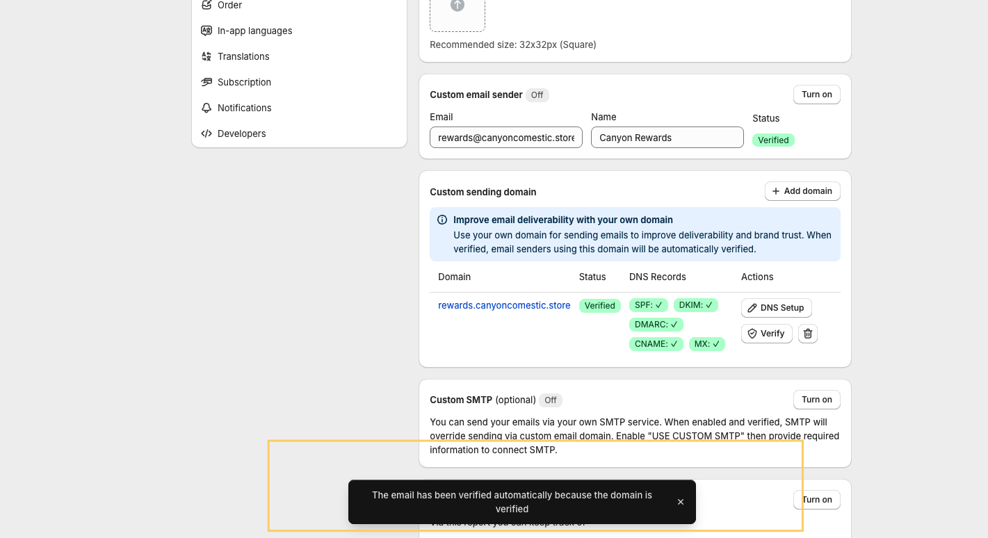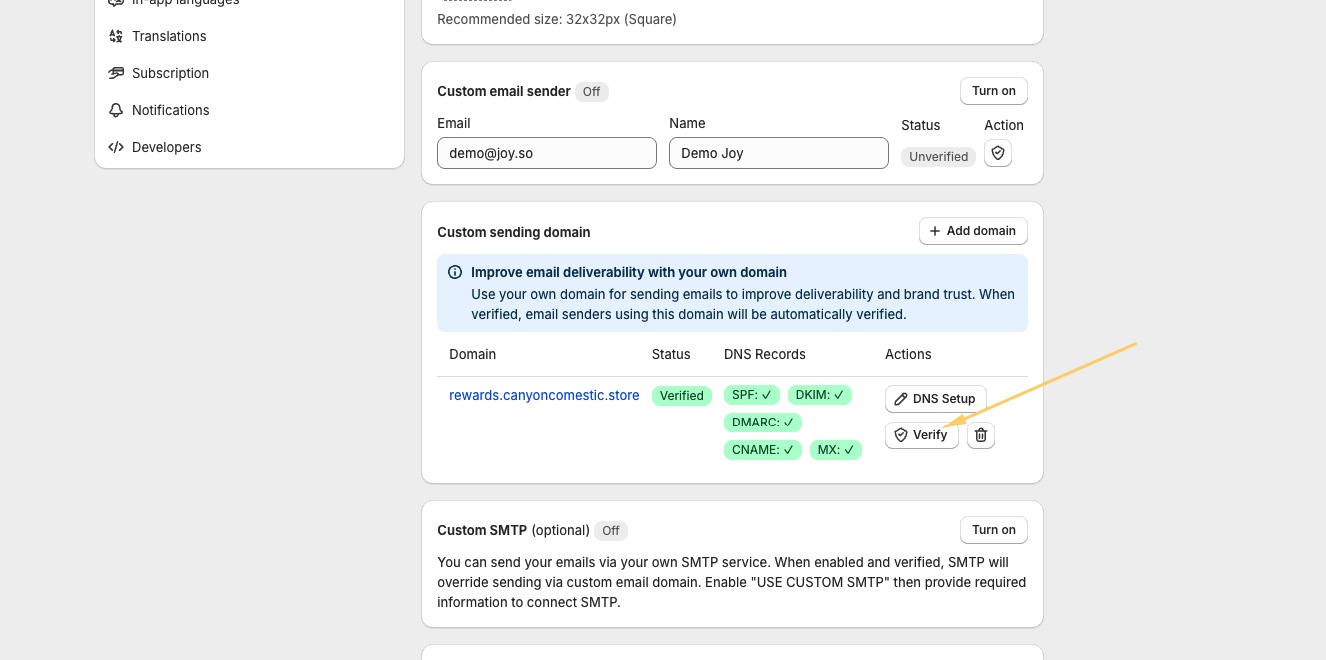 Set up a custom sending domain in Joy to send loyalty program emails from your own domain (e.g., [email protected]), providing the highest level of email authentication and brand consistency.