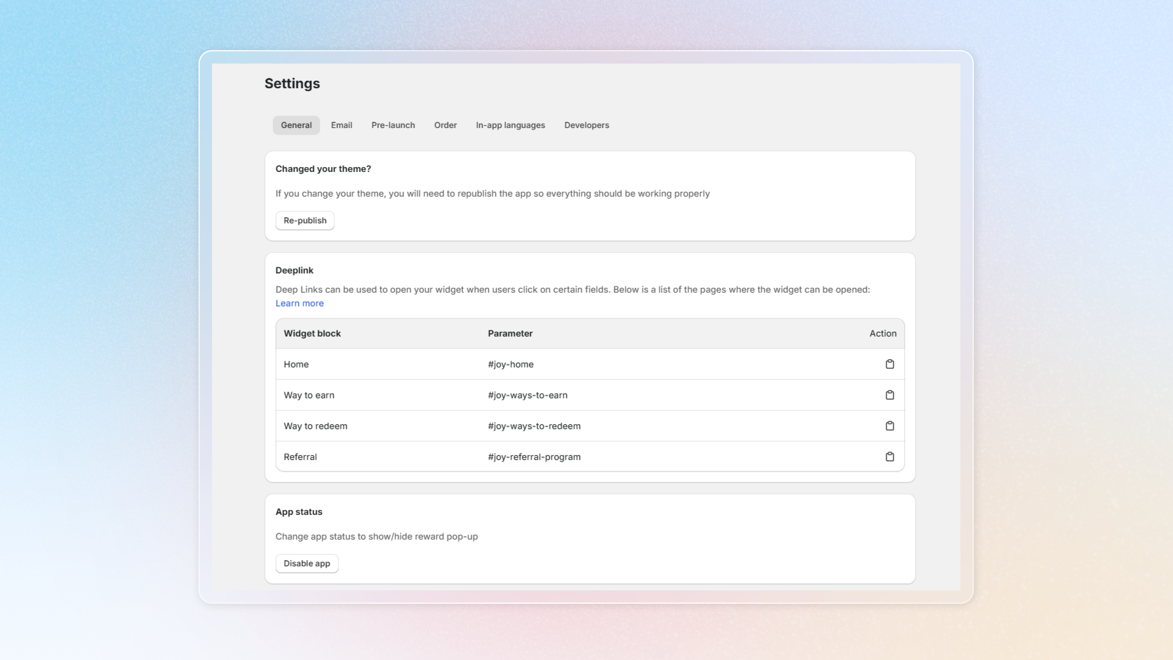 In General settings, you can see deep links here. Learn [how to use deep links](https://help.joy.so/settings/developers/deeplink)