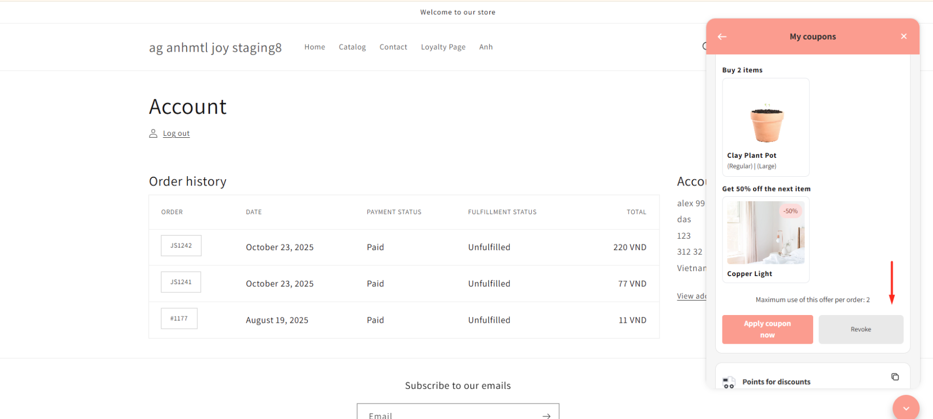 Q: Can customers revoke a coupon that has already been used in an order? A: No. The system automatically checks the coupon status with Shopify. If the code has already been used at checkout, the Revoke button will be disabled or hidden.