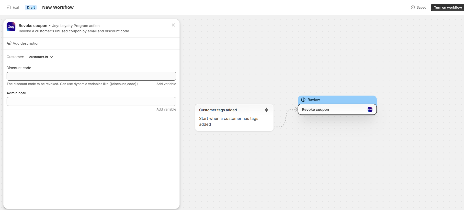 For advanced workflows, Joy Loyalty now supports a Revoke Coupon action in Shopify Flow. This allows you to automate the revocation process based on specific triggers.
