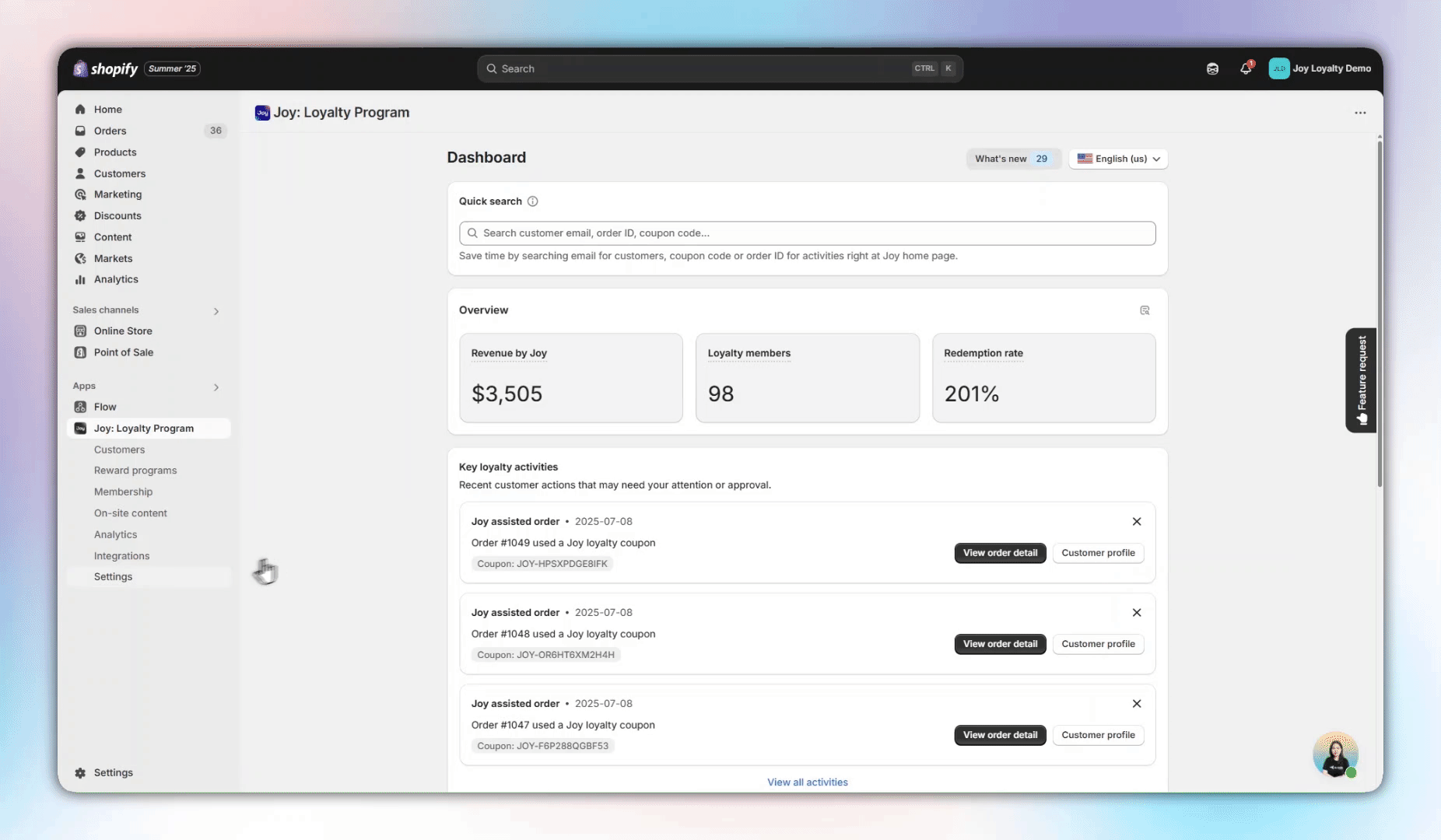 When you enable "Display awaiting points," Joy will automatically create activity logs for every new order placed by customers. These logs will appear in multiple locations throughout your loyalty system: